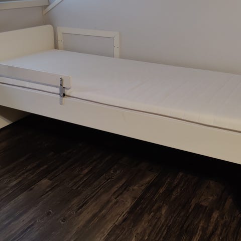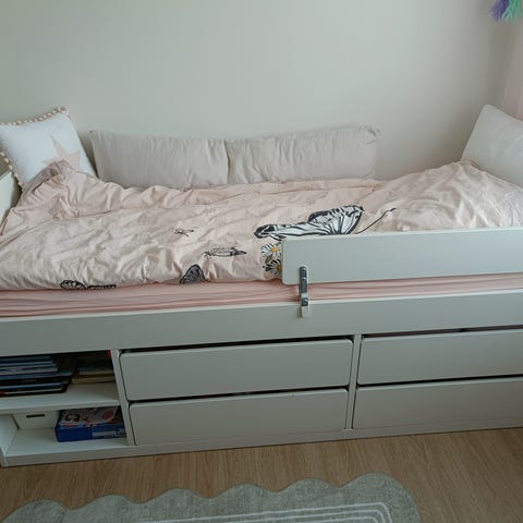 Ikea släkt säilytyssänky 90x200 cm, väri valkoinen. Sängyssä on irrotettava turvalaita. Rungon alla on säilytysratkaisuna vetolaatikoita ja avohyllykkö esimerkiksi vaatteille, leluille tai kirjoille. Sängyn mukana tulee 90x200 cm patja ja patjan suojus mikä hylkii nesteitä. Kokonaisuus soveltuu erityisesti lasten tai nuorten huoneeseen, kun tarvitaan sekä nukkumis- että säilytystilaa pienessä tilassa.