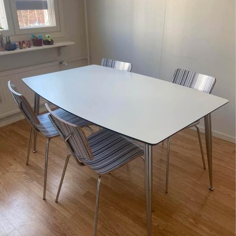 Ruokapöytä ja 6 tuolia. Arne Jacobsenin 7 sarja. En muista merkkiä