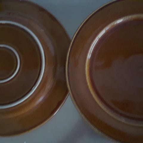 Myydään kaksi upeaa, aitoa 1970-luvun retro-lautasta. Valmistaja brittiläinen Biltons (Staffordshire). Lautasissa on tyylikäs ruskea-valkoinen graafinen kuviointi, joka sopii erinomaisesti retrohenkiseen kotiin tai kattaukseen. Materiaali on kestävää Ironstone-kivikeramiikkaa. Erittäin siistit ja ehjät, kirkas lasite. Ei halkeamia tai lohkeamia. Halkaisija 23 cm, korkeus 3 cm. Vain käteiskauppa.