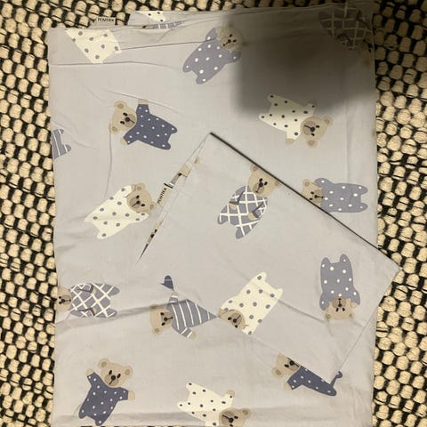 Lasten tilkkutäkki päiväpeite, koko 150*108 cm. Toinen puoli muumifiguureita ja toinen nalle/sininen.