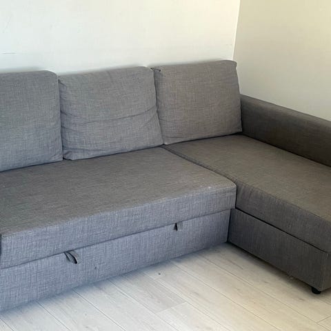 Kohtuukuntoinen Ikean kulmavuodesohva. Mekanismi toimii, elämisen jälkiä kankaassa (kts kuva).