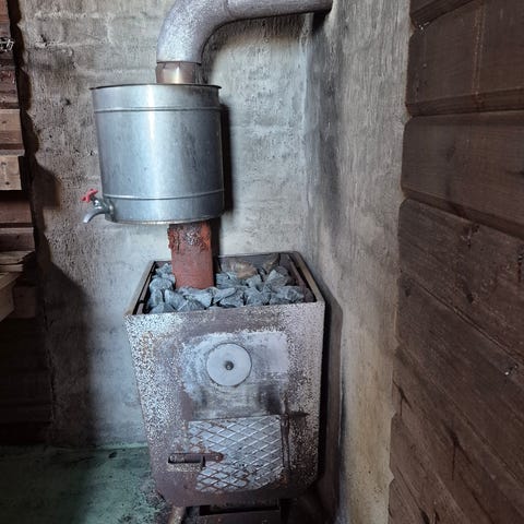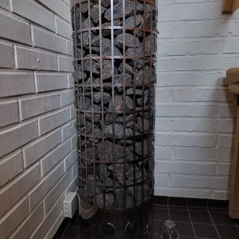 Kuvan mukainen pyöreä puukiuas. Valurautaa. Korkeus n.80cmja lev 50 cm. Eilen viimeksi lämmitetty.