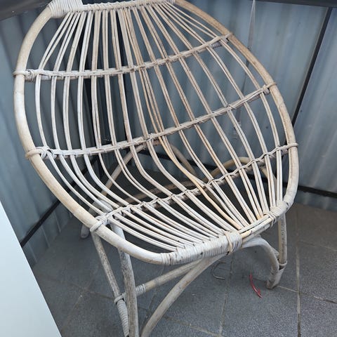 Elämää nähnyt rottinkisetti. Pehmusteet ja pöydän pyöreä lasi löytyy.
