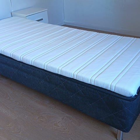 Jysk sänky ja sijauspatja. Runko on verhoiltu mustalla kankaalla ja sängyssä on irrotettava vaalea sijauspatja. Sopii yhden hengen vuoteeksi esimerkiksi makuuhuoneeseen tai vierashuoneeseen.