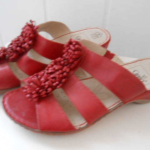 Käyttämättömät 1950-luvun/vintage -tyyliset kiilapohjaiset kangassandaalit. Puna-valkoinen ruutukuosi ja kukkakoristeommel. Remmikiinnitys kantapään takaa. Kiilapohja, jossa juuttipinta.