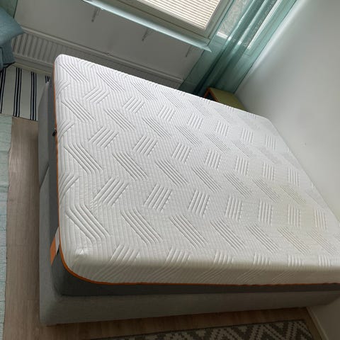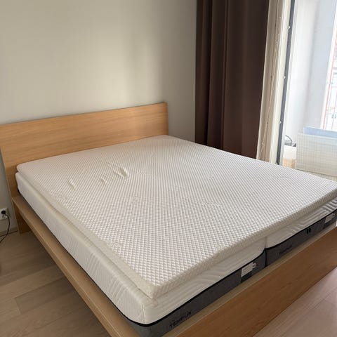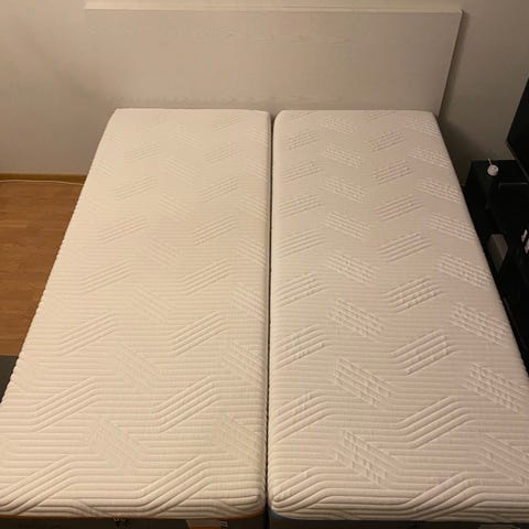Tempur sänky ja patja. Sängyssä on tumman verhoilun runko ja vaalea Tempur-patja. Kokonaisuuteen kuuluu paksu patja sekä erilliset sijauspatjat (kova ja toinen pehmeä). Materiaalina on Tempur-vaahto, joka muotoutuu kehon mukaan ja tukee nukkujaa. Ostettu 2011. On edelleen hyvässä kunnossa, mutta vaatii pesua.