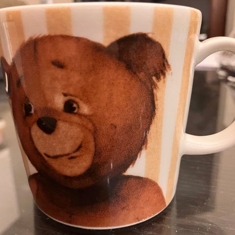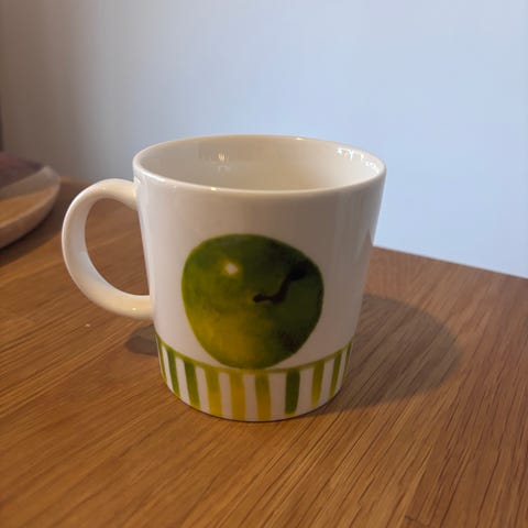 Arabia mukit, joissa vihreä omena -kuvio ja vihreä-valkoinen raitareuna. Valkoista keramiikkaa, perinteinen kahvamuki. Sopivat esimerkiksi kahvi- tai teemukeiksi arki- ja kattauskäyttöön. Kulkeutuu tarvittaessa su 19.4 Helsinkiin