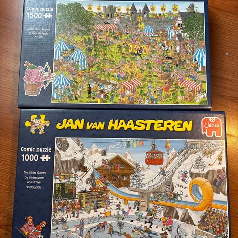 Jan van Haasteren ja King Comic Collection palapelit, 1000 palan sarjakuva-aiheisia palapelejä. Useita eri kuvituksia, kuten kuumailmapalloja, kaupunkinäkymiä ja vilkkaita katukohtauksia. Mukana myös Scenic Spot of the World -kaupunkimaisemapalapeli 1000 palalla. Sopivat koko perheelle ja palapeliharrastajille, palojen määrä 1000 kpl per laatikko.