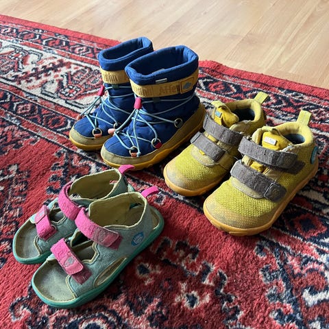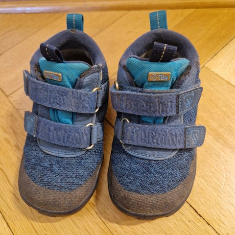 Affenzahn dino välikausi/talvilengät kokoa 25. Noin kolmella lapsella käytössä olleet. Kuluminen näkyy erityisesti kengän kärjen koristesaumassa, joka on kulunut rikki. Pohja on muuten hyvässä kunnossa, mutta kantapäissä näkyy kulutusta. Tarrat toimii.