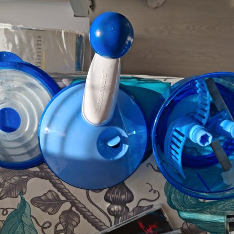 Tupperware monitoorileikkuri punainen muovinen. Käsikäyttöinen leikkuri, jossa kampimekanismi kannessa. Kulho on läpikuultavaa punaista muovia ja kannessa on Tupperware-logo. Soveltuu esimerkiksi vihannesten, yrttien ja muiden elintarvikkeiden pilkkomiseen ja sekoittamiseen keittiössä.