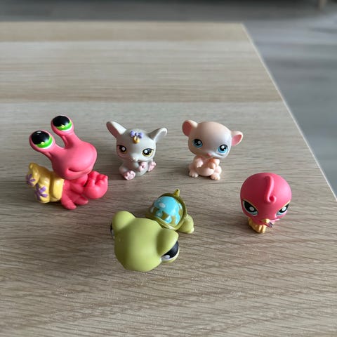 Myydään 3 kpl Littlest Pet Shop keräilyhahmoja. Hahmot ovat teemaltaan "Sweetest Hide & Sweet", ja ne on suunniteltu näyttämään leivoksilta. Hahmot voi painaa pohjaan ja ponnauttaa ylös. Myydään koko settinä.