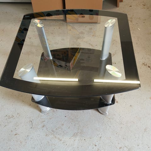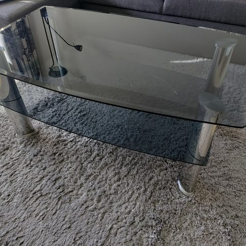 Myynnissä kuvan mukainen sohvapöytä. Pituus 96 cm, jalkojen väli lattian kohdalla 101cm×57cm. Lasi on irroitettavissa . Hinta 38e.