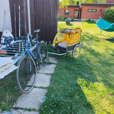 Kärryyn voi ilmeisesti asentaa etupyörän, jolloin sitä voisi käyttää rattaina, mutta tässä ei ole etupyörää mukana.