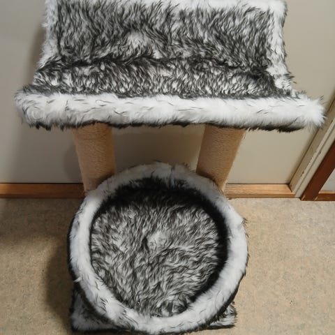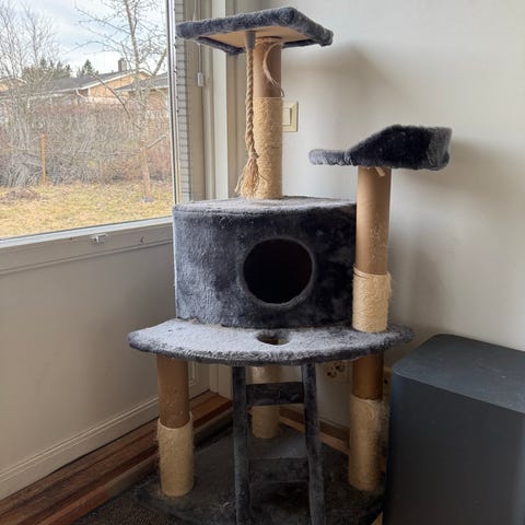 Kissan kiipeily/raapimispuu. Ostettu zooplussasta ja on piparkakkutalo raapimispuu nimellä myynnissä. Osia vaihdettu eri kohtiin.