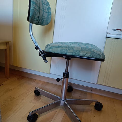 Työtuoli joka päällystetty paksulla mustalla tekonahalla.