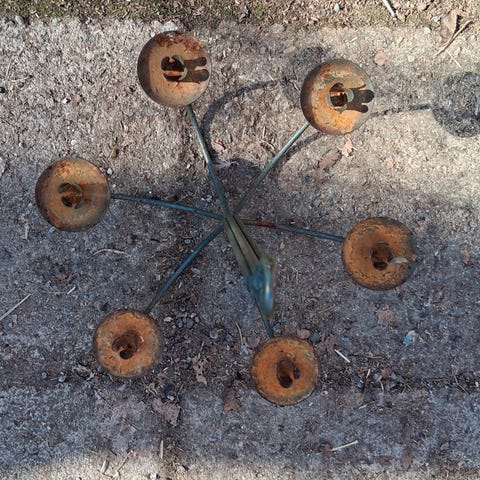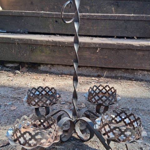 Iso lattiakynttelikkö, metallia, tuikkukupit lasia. Ne pysyy kiinni kierteillä. Korkeus 69 cm.