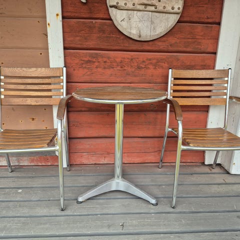 - Pöytä on rautarunkoinen mutta pöytälevy muovinen.