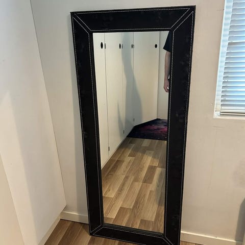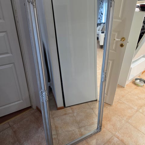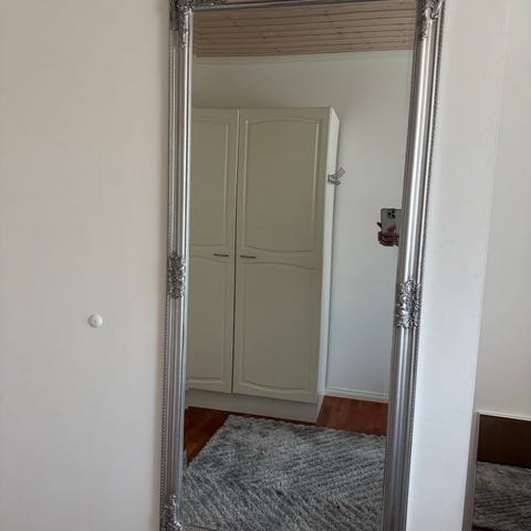 Jysk kokovartalopeili valkoisella kehyksellä. Peili on vapaasti lattialla seisova, takana tukijalka ja tukinaru. Kehyksessä on koristeellinen reunus. Sopii esimerkiksi makuuhuoneeseen tai eteiseen pukeutumis- ja kokovartalopeiliksi.