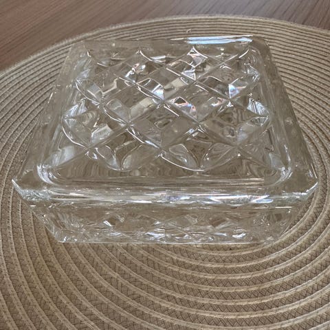 Pyöreä, painava, mutta silti siro kannellinen rasia, joka mielestäni on kristallia ja fasettihiottu.