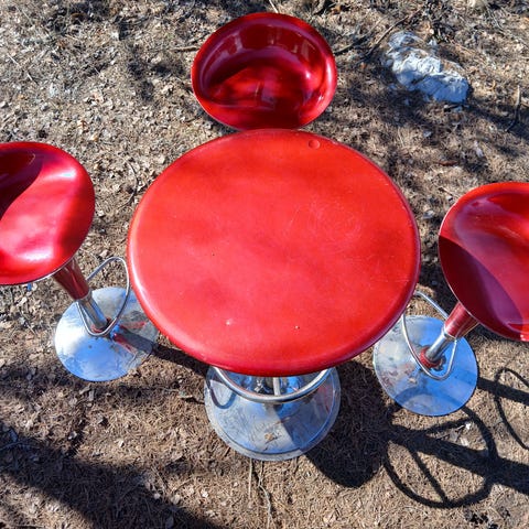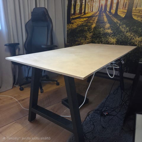 Pöytä ollut alunperin toimistokäytössä, mutta nykyään toiminut ruokapöytänä. Pöytä on merkiltään Futra ja tuolit Narbutas. Pöytiä on kaksi settiä, pyyntihinta on per setti. Koiratalous.