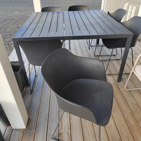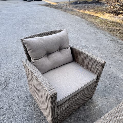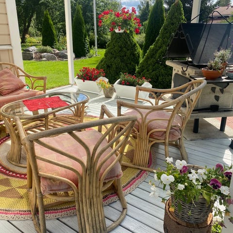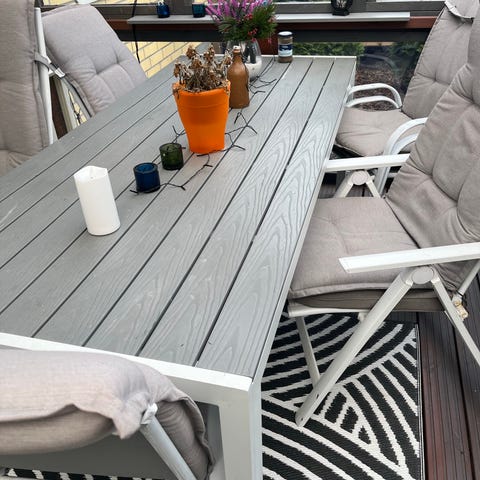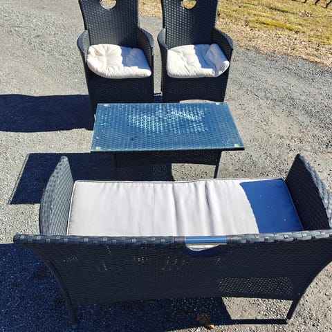 Terassikalusteryhmä, johon kuuluu kaksi nojatuolia, sohva ja pöytä lasikannella. Sopii käytettäväksi terassilla tai parvekkeella ulkokalusteena. Mukaan saa myös pehmusteet, nämä eivät ole edes ollut meillä käytössä. Voi pyytää erikseen kuvaa pehmusteista.