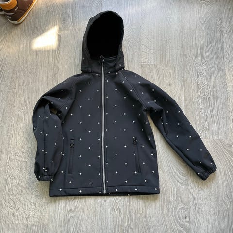 Siisti, ehjä ja hyväkuntoinen Name it lasten softshell-takki, koko 140. Väri musta ja materiaali polyesteriä. Unisex-mallinen takki, jossa vetoketjukiinnitys edessä ja huppu. Takissa on heijastinyksityiskohtia sekä joustavat hihansuut. Sopii arkeen ja ulkoiluun lapselle, joka käyttää kokoa 140.