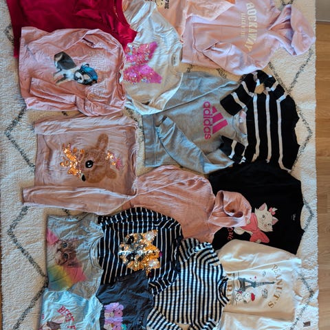 Iso vaatepaketti 128-134 cm tytölle. Legginsejä, farkut, college- ja t-paitoja sekä ulkoiluvaatteita. Merkkeinä mm.Marc O' Polo, P.O.P, Gugguu, Reima, R-collection ja Lindex. Kukkakuvioisessa P.O.P collegepaidassa on resorin kohdalla näkyvää purkautumista.
