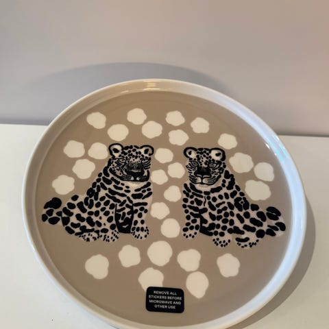 Marimekko Oiva-sarjan lautanen, Kaksoset kuviolla. Lautasen halkaisija 20 cm. Väri greige (beige / harmaa). Uusi, käyttämätön, tarrat paikoillaan. Löytyy 4 kpl.