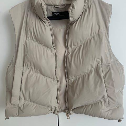 Zara liivi, naisten koko M. Väri valkoinen. Liivissä on korkea kaulus ja hihaton malli.