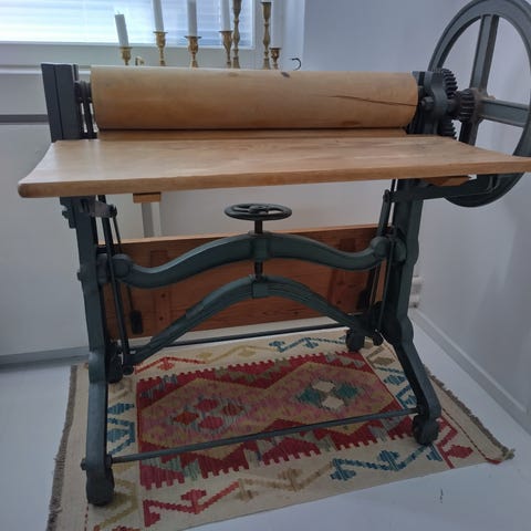 1900-luvun alkupuolelta kotoisin oleva vanha mankeli. Käyttökunnossa. Vaatii putsausta ja huoltoa. Pyörät alla, jotka helpottaa liikuttelua. Vain nouto Heinolasta. Kannettava alas rintamamiestalon yläkerrasta.