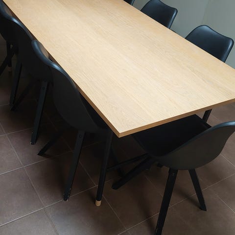 Myydään jämäkkä jatkettava täysi puinen ruokaryhmä kahdeksalla tuolilla. Käytön jälkiä pinnoissa. Muuten hyvässä kunnossa. Jatkopala 50cm joka kuvassa paikallaan.