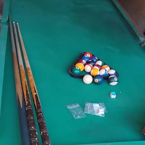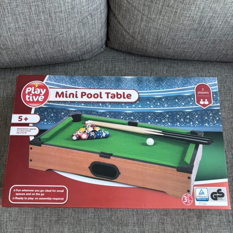 Pool table game. Pöydässä on vihreä pelialusta. Mukana tulee kaksi keppiä, muovinen kolmio sekä värilliset pallot. Nouto. Käteinen.