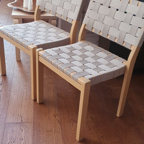 Myydään 5 kpl Artekin 69-tuolia. Vaihteleva kunto: osassa pientä halkeamaa puussa tai jälkeä istuinosassa. Osasta puuttuu ruuveja, osassa lakkaus kulunut, osa hyvässä kunnossa. Istuinosa keinonahkaa. Kaikki kerralla, yhteishinta!