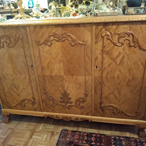 Kaunis ja hyväkuntoinen lipasto neljällä laatkolla. Kannen pinnassa vähäistä jälkeä. Pöydän korkeus 84cm, suurin leveys 94cm, suurin syvyys 55cm (tason syvyys 45cm). Tason reuna ja jalkojen koristeet käsin veistetyt.