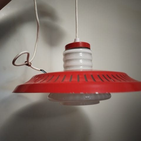Peltinen punainen lamppu, jota voi pitää pöydällä tai kiinnittää seinään. Tässä on lyhyt noin 40 cm johto ja pistoke vanhan mallinen, joten en pysty testaamaan.