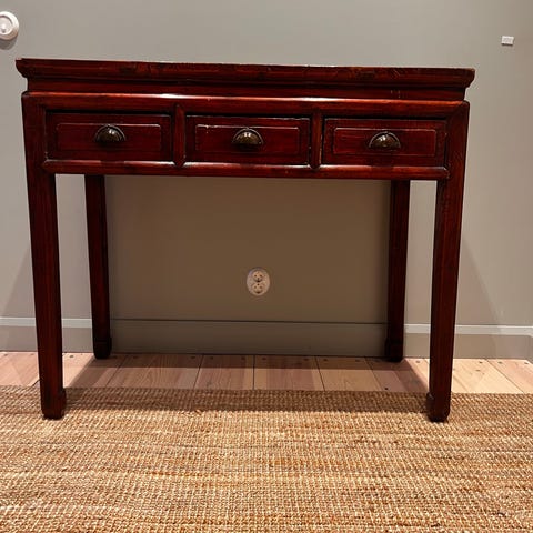 Ehjä puinen pöytä, maalipinta kulunut. Mitat: pituus 94,5, leveys 51 cm ja korkeus 72 cm.