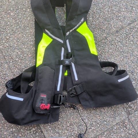 Selkäpanssari, kyynärsuojat ja vedenpitävä kännykän/lompakon tasku.