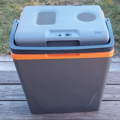 Clas Ohlsonista viime kesänä ostettu Asaklitt -merkkinen kylmälaukku. Sähkökäyttöinen jossa on sekä viilennys- että lämmitystoiminto. Laatikossa on sisäänrakennettu tuuletus ja lämpötilanäyttö kannessa. Virtaliitäntänä on 12 V pistoke, joka sopii auton tupakansytytinliitäntään.