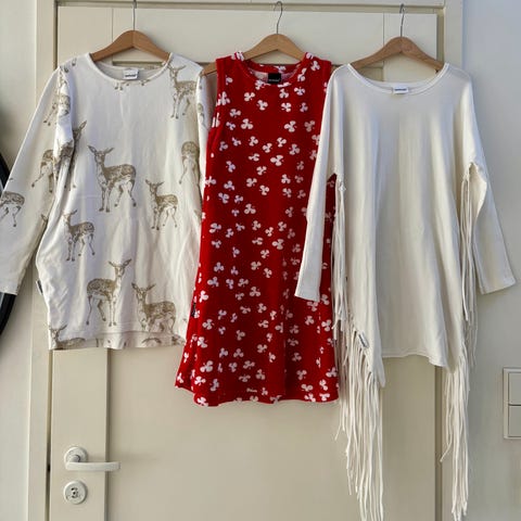 Myyn tyttöjen vaatteita koossa 128–134/140. Settiin kuuluu: 5 mekkoa (Marimekko, s.Oliver, Lindex, Happy Girls), 7 paitaa (Adidas, Sisley, H&M), mustat nahkajäljitelmälegginssit Zaralta, Mikki Hiiri -asu (paita ja housut) sekä Reiman rukkaset irrotettavalla sisävuorella, koko 5. Vaatteet ovat erittäin hyvässä kunnossa, kuin uudet.