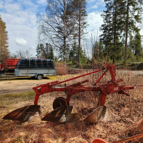 Kaksisiipinen aura traktoriin. Teräksinen runko ja kaksi aurasiipeä peltotöihin ja maan muokkaukseen. Soveltuu traktorin perään kiinnitettäväksi