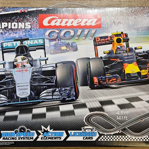 Carrera Go Formula speed autorata jossa perussetin lisäksi lisäosia. Koska osia ollut normaalia enemmän ne eivät ole mahtuneet kunnolla laatikkoon ja laatikko mennyt rikki.. On mahdollista,vettä radan osissa joku vaurioitunut.