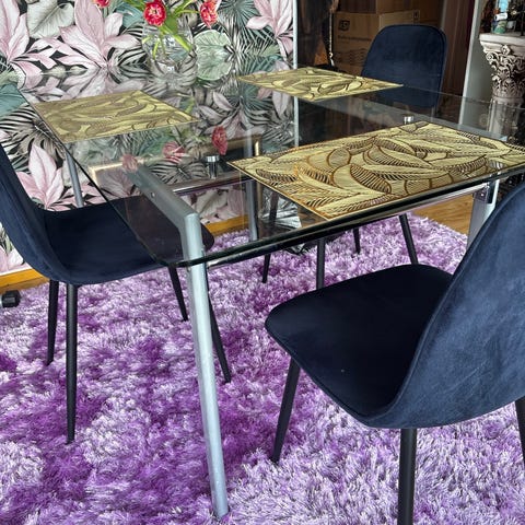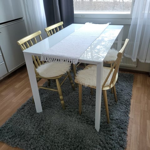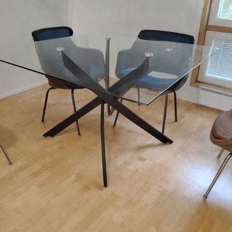 Myydään muuton tieltä lasinen ruokapöytä. Jalat ovat metallia, jotka on päällystetty puuta jäljittelevällä materiaalilla. Mukaan saa kolme hupullista tuolia halutessaan. Pöydän ääreen mahtuu yhteensä 8 tuolia.