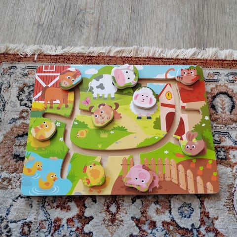 Hyväkuntoinen lasten labyrinttipalapeli, jossa eläinten päät pitää yhdistää oikein. Hieman kulumaa. Merkki: Viga Toys.
