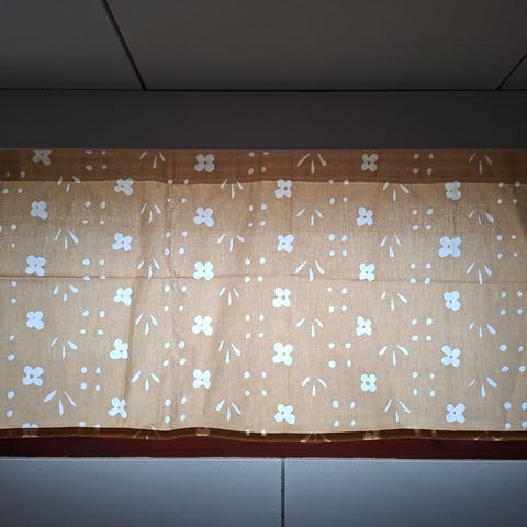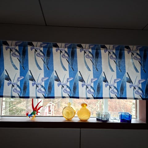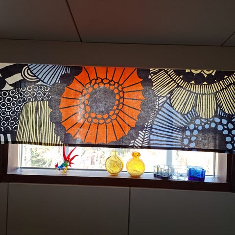 Käyttämätön verhokappa Marimekon Juhlaunikko-kankaasta. Leveän rypytysnauhan läpi voi pujottaa verhotangon. Tukevaa puuvilla-satiinia.
