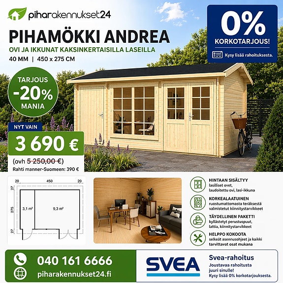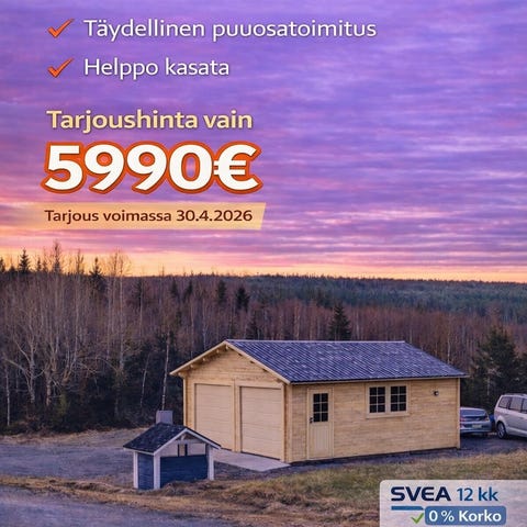 Garage D,moneen käyttöön, talli -varasto, koko 6x5,3m täydellinen puuosatoimitus, sis, kattotarvikkeet, ovet,helat, lukot, kasaustarvikkeet, ikkuna,HINTA ENNEN 8990E JA NYT TARJOUS 5990E,TARJOUS VOIMASSA 28,4,2026, TUOTE ON PAKATTU SÄÄ VARMAAN PAKETTIIIN, JOTEN VOIT KASATA SEN VASTA ENSI KESÄNÄ, VARAA OMASI NYT JA MAKSA VASTA KUN TALLI ON TOIMITETTU ,KYSY LISÄÄ 0401616666