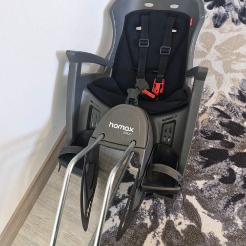 Kaksi hamax pyöränistuinta, pölyisiä, ehjiä.