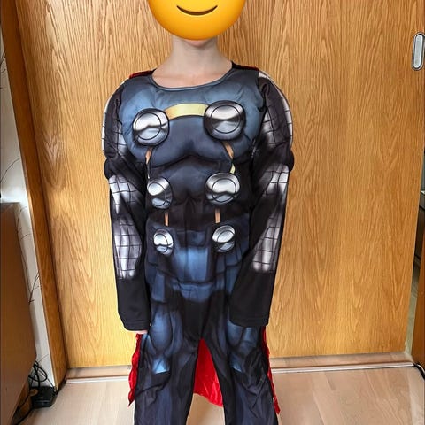Hulk naamiaisasu, mukana naamio. Koko 122/128 mutta joustaa ja sopii vielä 130 pituiselle.