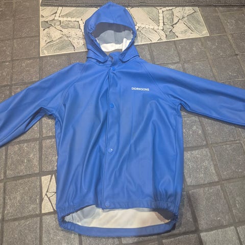 Myydään lasten sadetakki 120 cm. Mielestäni reilu koko. Nimikoitu.