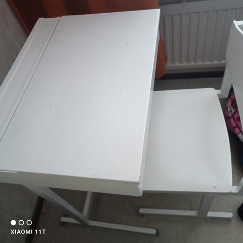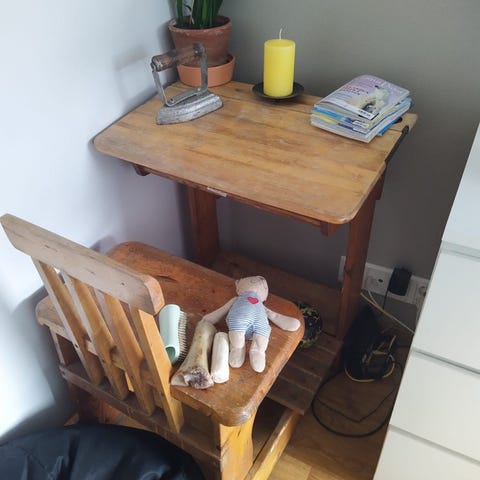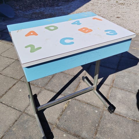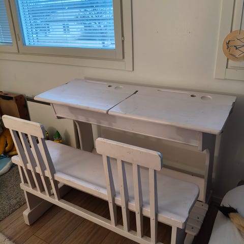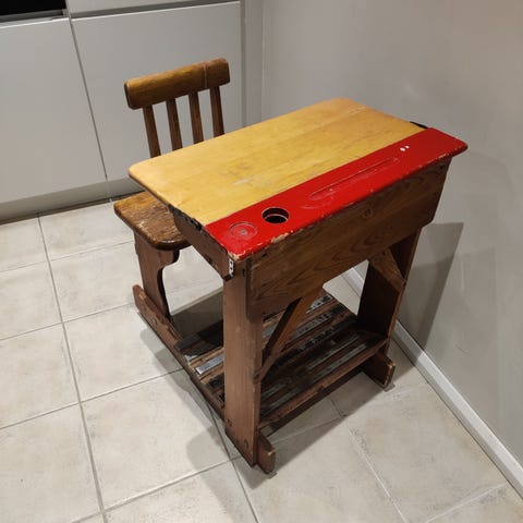 Ihana, vanha yhden hengen pulpetti. Käytönjälkiä näkyy, kuten kuvistakin näkee.