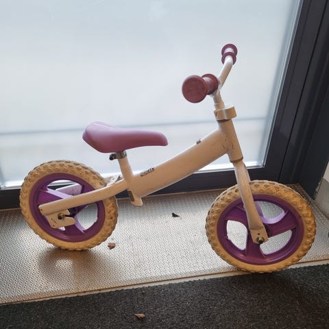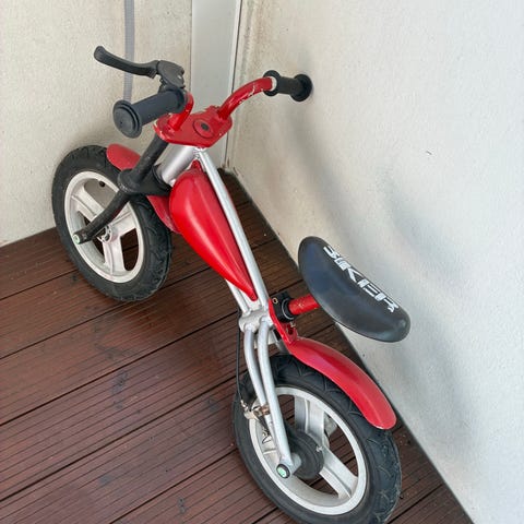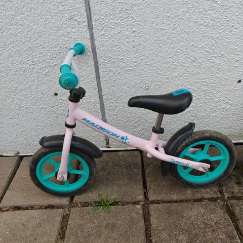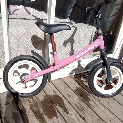 Eturenkaaseen kiinnitettävät polkimet mutta meillä mennyt potkupyöräkäytössä Noin 2-vuotiaana. Takarenkaat voidaan liikuttaa leveälle tai kapealle asetukselle joten vakautta saa säädettyä.